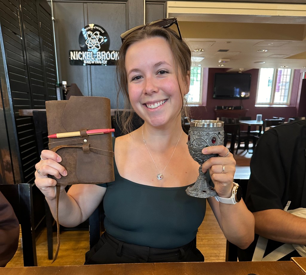 Kayla with the graduate chalice, about to enjoy a celebratory drink at the Phoenix