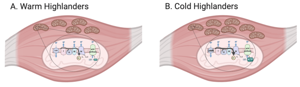 We are using a comparative approach with deer mice to examine how phenotypic plasticity and/or evolutionary adaptation to high altitude has altered mitochondrial physiology (see Comparative & Evolutionary Physiology for a description of our lab colonies and experimental manipulations). Our work has shown that exposure to the cold and hypoxic environment at high altitude leads to plastic adjustments in mitochondrial physiology that increase oxidative capacity in thermogenic tissues. High-altitude populations of deer mice have also evolved increased oxidative capacity and mitochondrial O2 affinity in skeletal muscles compared to low-altitude populations. Ongoing research is working to uncover the mechanisms of these changes, to examine how changes in mitochondrial physiology contribute to ROS homeostasis, and to elucidate the signalling mechanisms responsible for adjusting mitochondrial metabolism.