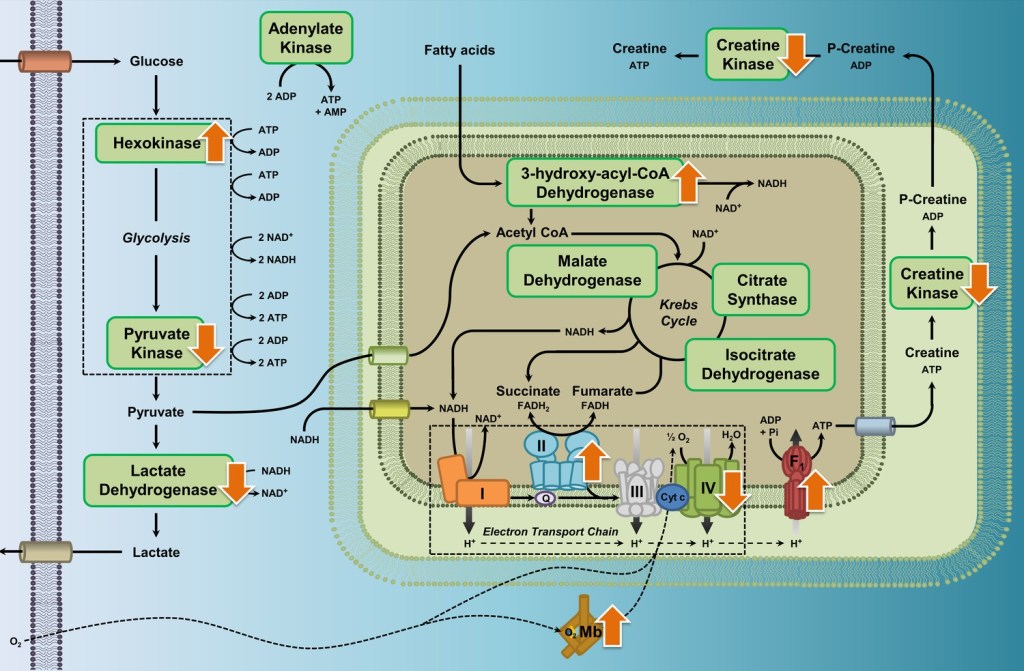 Common differences in metabolic enzyme activities and myoglobin content in the flight muscle were observed across several species of high-altitude waterfowl compared to their close relatives from low altitudes, shown as orange arrows in the figure above (Dawson et al. 2020).